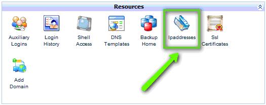 Để gán một địa chỉ IP dành riêng cho trang web của bạn, đăng nhập vào VPS Kloxo. Từ màn hình Home nhấp biểu tượng "Ipaddresses" trong hộp "Resources"
