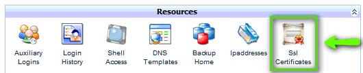 - Đăng nhập vào VPS Kloxo và vào lại màn hình Home. Trong hộp "Resources" nhấp vào biểu tượng SSL Certificates .