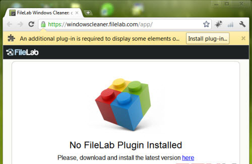 Trước khi sử dụng dịch vụ, bạn cần cài thêm FileLab Plugin vào hệ thống. Bạn chỉ việc nhấp vào dòng Please, download and install the lastest version here để tải plugin rồi cài vào máy. Cài xong, bạn nhấn F5 để làm mới trình duyệt web và bắt đầu dọn dẹp hệ thống.